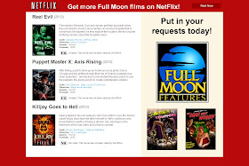 -Desde el 6 de noviembre, Full Moon Features ya se encuentra disponible en el canal de internet NetFlix (donde se pueden ver films por demanda mediante pago) con sus títulos más recientes, y donde a futuro se incorporarán otras películas si el pedido y el interés de los usuarios es favorable.